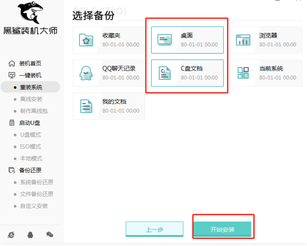第五步在打开的界面中选择重要的文件进行备份后点击“开始安装”系统。