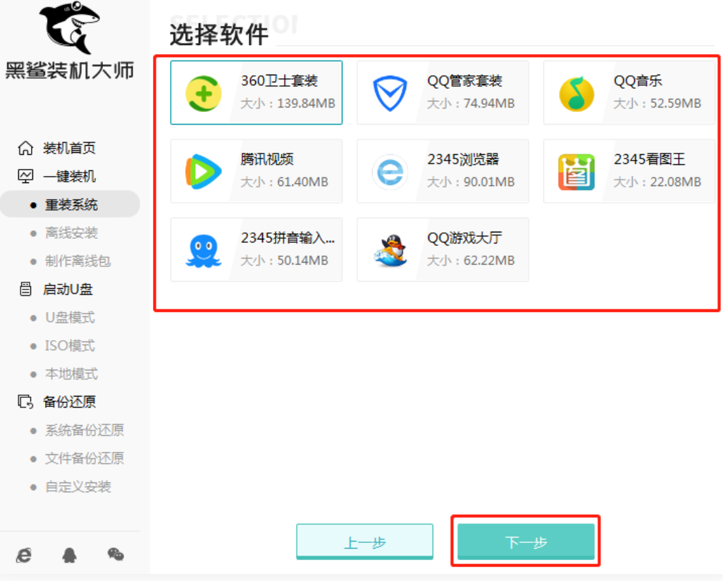 第四步黑鲨会提供常用装机软件,因为重装过程中会格式化系统盘,大家可以自行勾选。