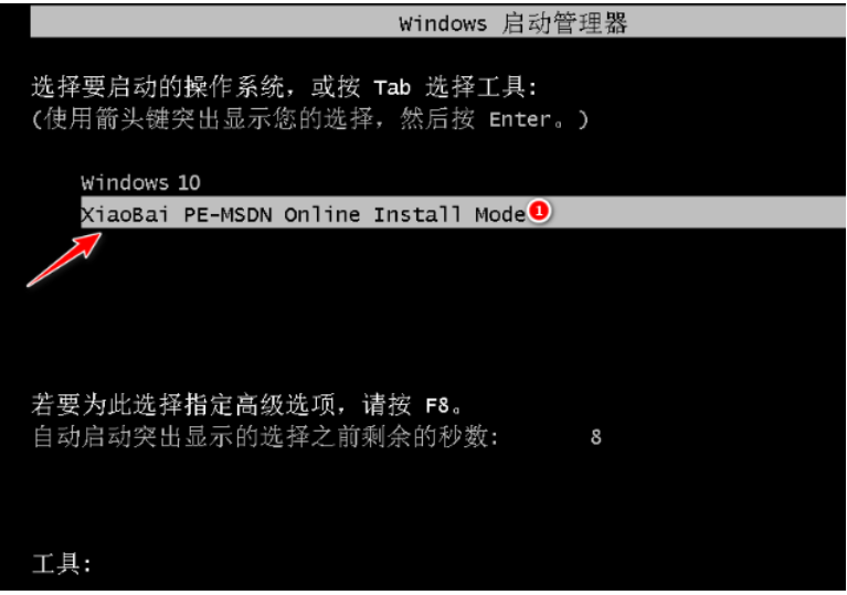 4、重启后进入了开机界面,选择xiaobai-pe系统进入。