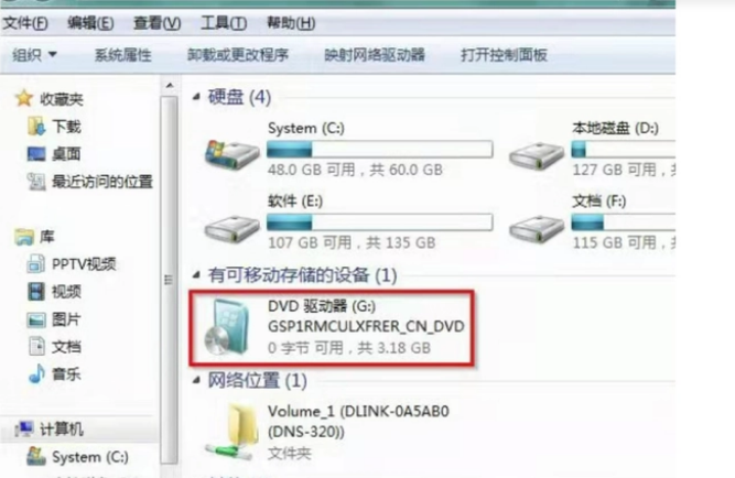 1.首先我们先要准备一个DVD光盘,然后再刻录自己想要安装的系统到光盘上,把系统刻录好系统的光盘放进光驱里面,然后在电脑计算机里就可以看到我们的光盘了。