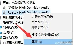 3、在响声.在视频音频游戏控制器列表中,查询是否有黄色感叹号,右键音频输出设备的选择特性