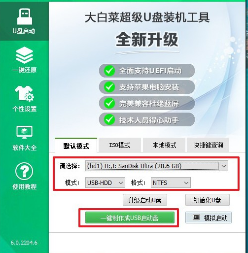 1.一体机怎么重装系统教程,首先我们将U盘接入电脑,解压并打开大白菜U盘启动盘制作工具,它会自动识别U盘,默认设置,点击一键制作成U盘启动盘即可。