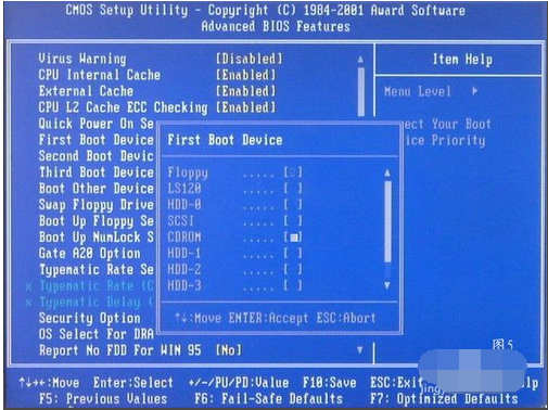 5、看到那个圈圈住的地方按回车进入,选择下图所示的然后按光标选择CDROM,按回车确认。