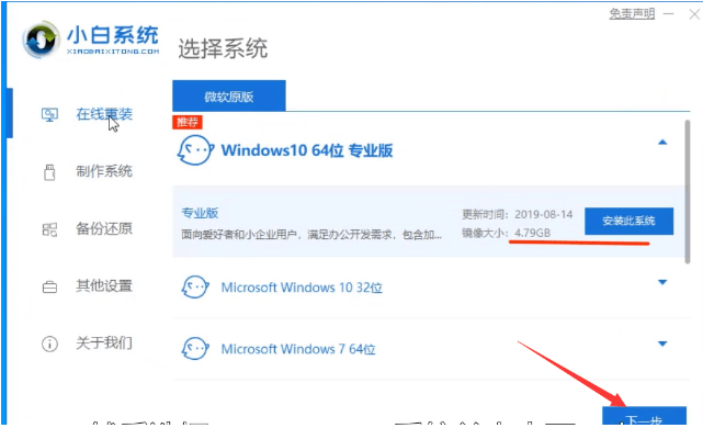2、选择在线重新安装,选择需要安装的系统,然后进行下一步。