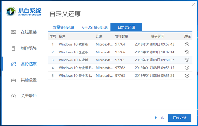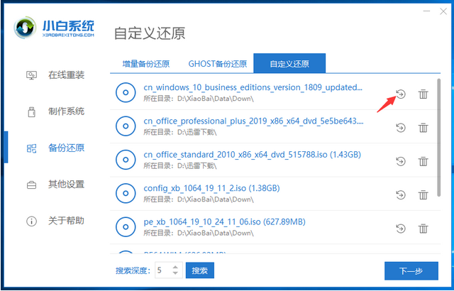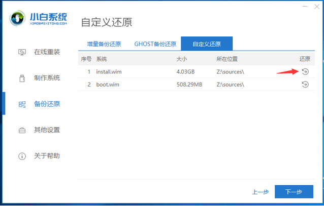 3、在小白一键重装的备份还原页面内选择自定义还原,点击系统iso镜像文件后面的还原按钮。