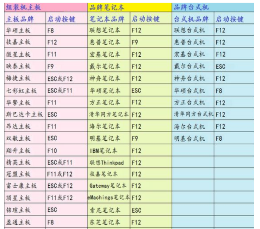 1、各品牌电脑重装系统快捷按键如下图所示: