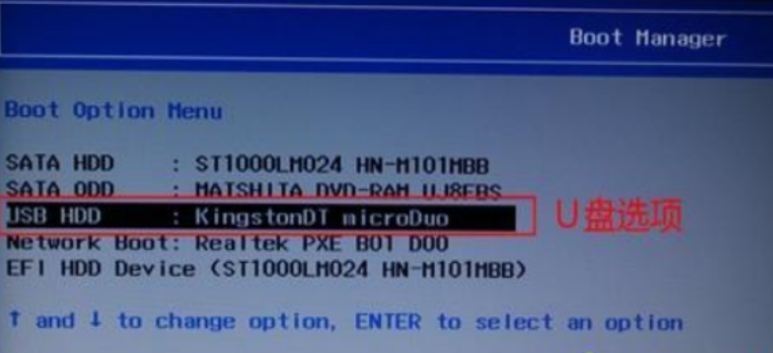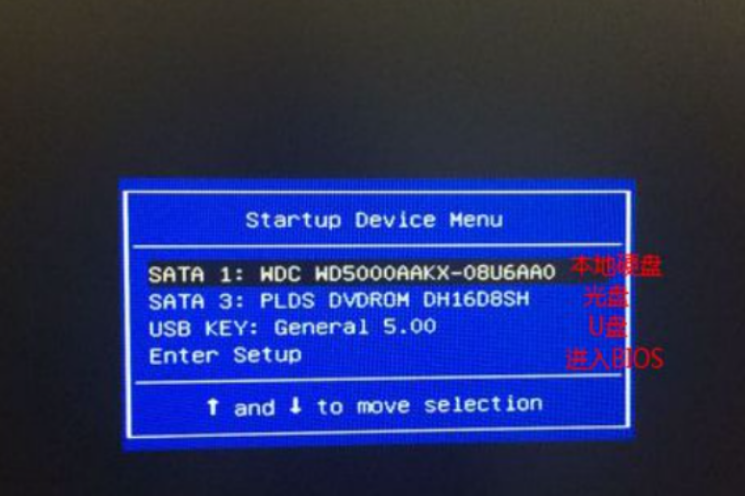 3、然后会跳出启动项选择菜单,以下图为例,DVD表示光盘,USB KEY表示U盘,选择一项,按回车,就可以进入光盘或U盘重装界面。