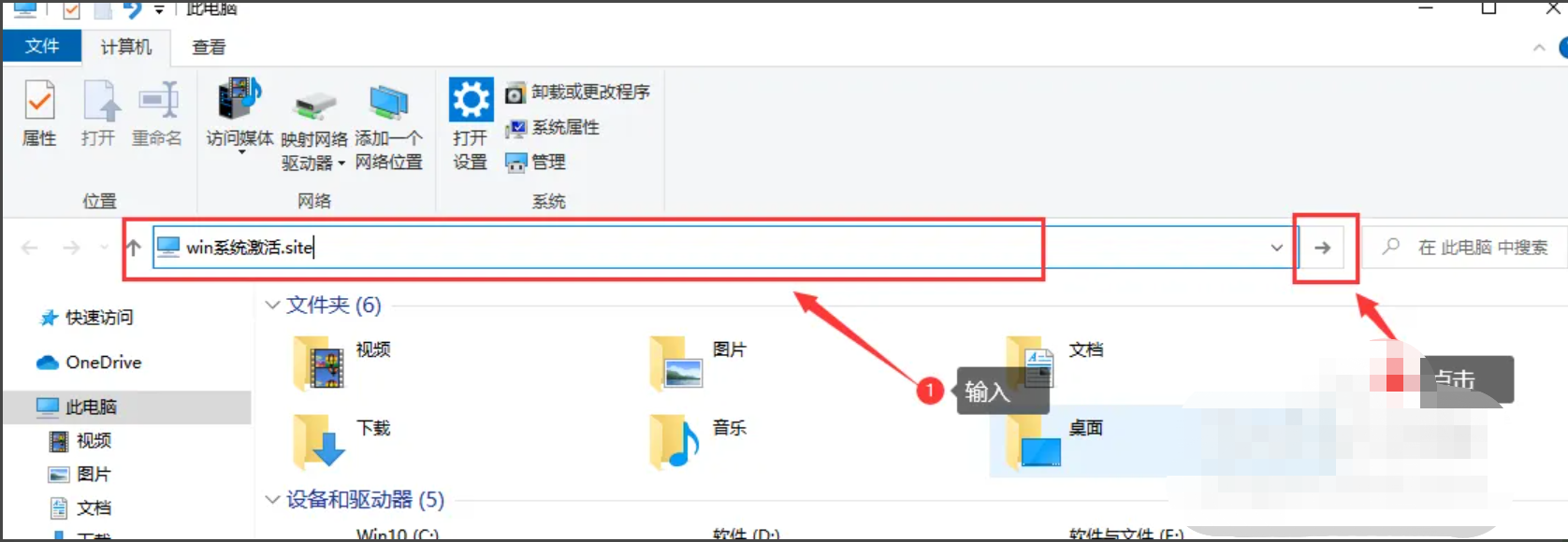 2、打开【此电脑】以后在顶部输入:win系统激活.site【鼠标移到右侧的箭头点击一下】。