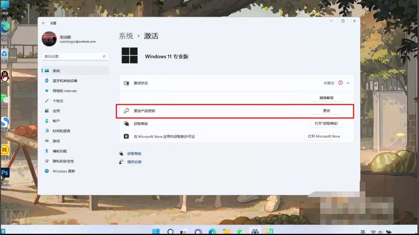 5、可以看到系统还没有激活的提示,点击更改产品密钥,等待弹出输入密钥窗口,把复制的密钥复制进去,再点击下一页然后选择激活。