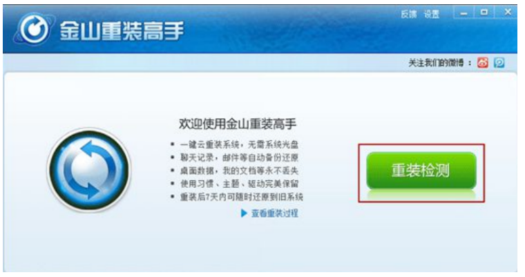 1、我们先在电脑上下载安装并打开"金山重装高手",点击"重装检测"。