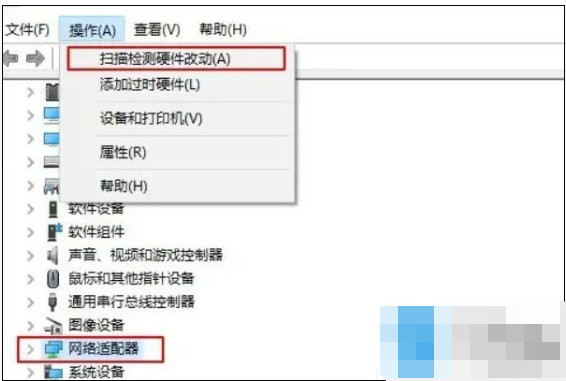 2、 点击“ 网络适配器 ”的选项,然后再单击上方的“ 操作 ”,选择“ 扫描检测硬件改动 ”。