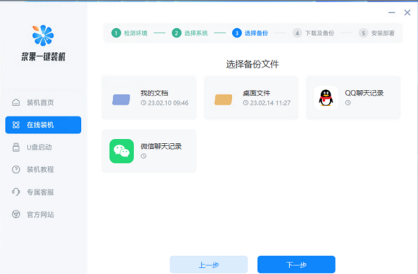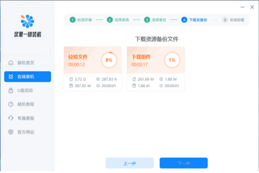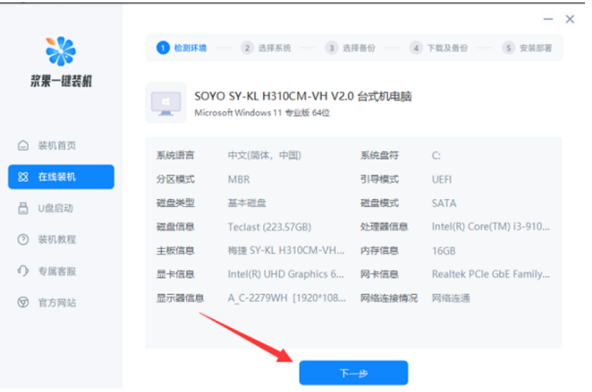 1、首先下载安装浆果一键装机软件,选择左边栏的“在线装机”功能。