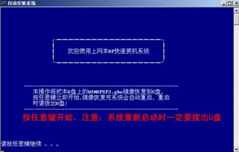 步骤4:在U盘上启动【WINPE】,然后对新副本进行分区。鼠标双击【自动安装系统】,通过按下【任意键】来复制系统。复制完成,系统就会自动重新启动安装。