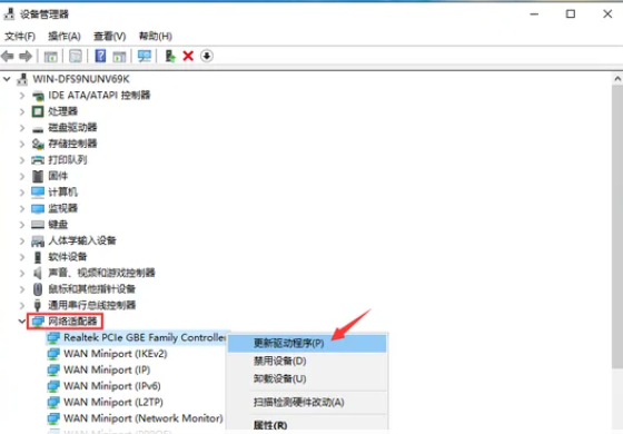 2、接着我们在设备管理器中,展开网络适配器,右键当前的网卡选择“更新驱动程序”。