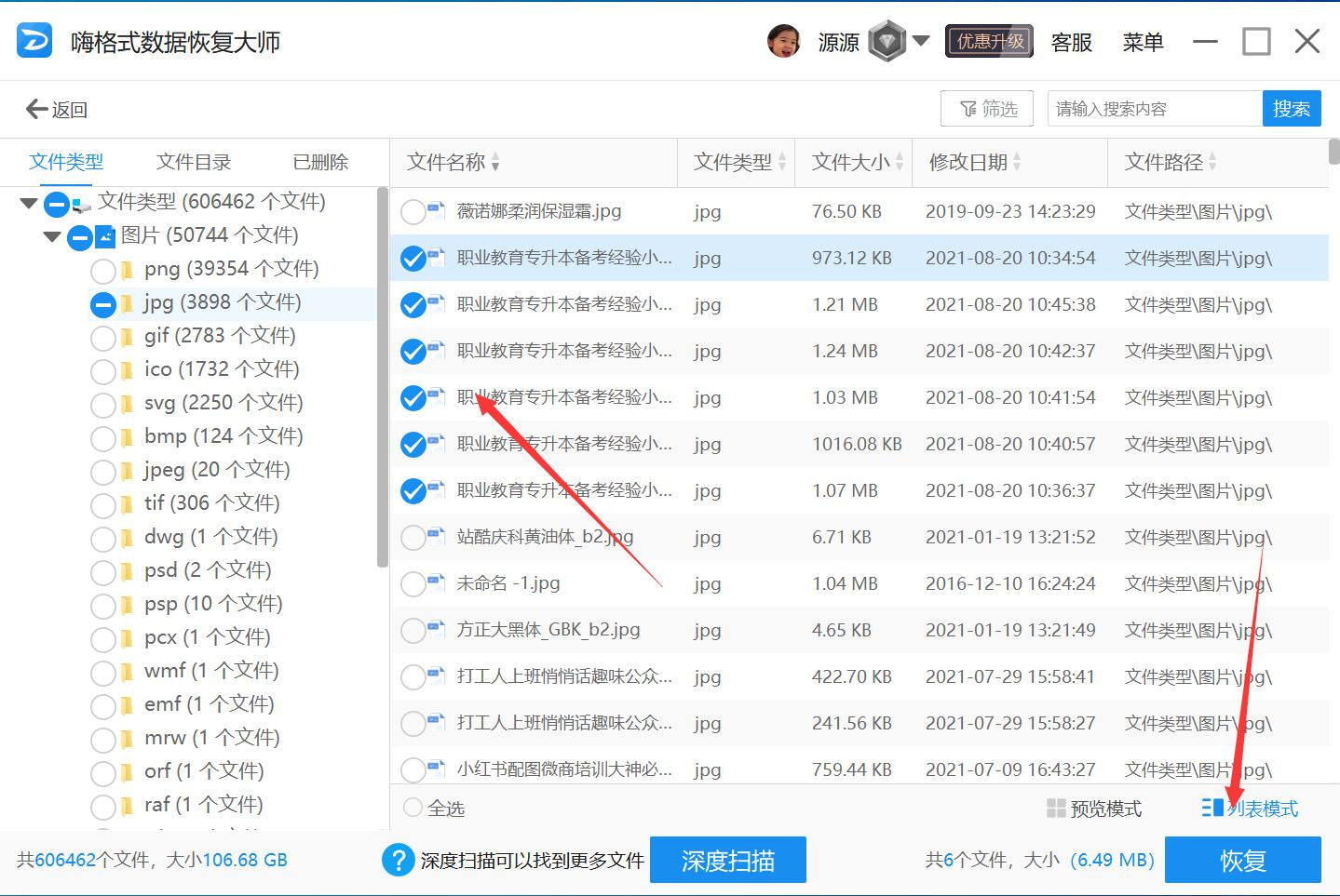 3、耐心等数据扫描完成后,选择需要恢复的文件,点击下方“恢复”。