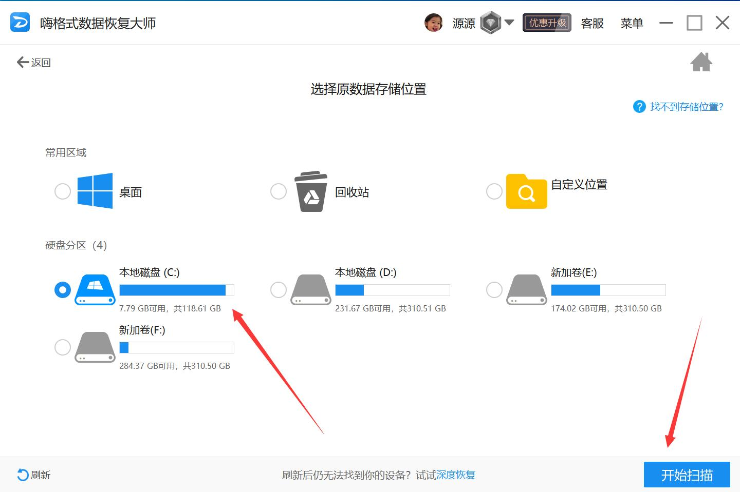 2、然后我们选择原文件的存储位置,默认选择为C盘,选好点击“开始扫描”。