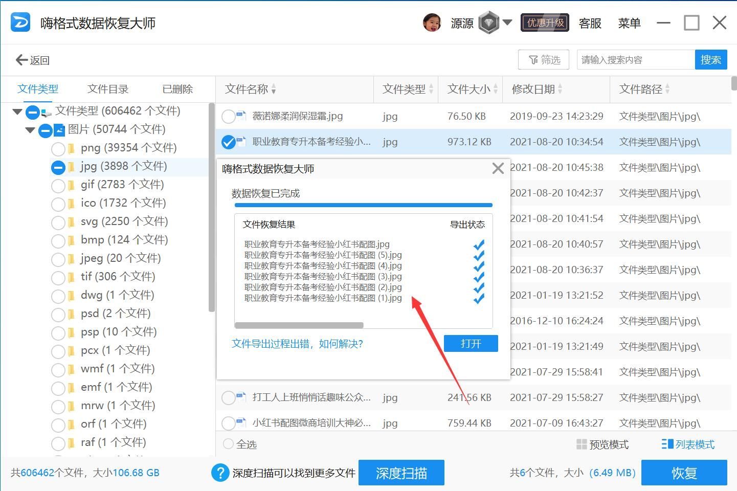3、耐心等待数据扫描完成后,选择需要恢复的文件类型,立即恢复,软件将对这些数据进行恢复的操作。