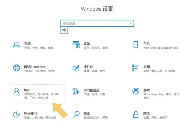 2、在进入系统设置后,在弹出的界面里找到“帐户”。如下图: