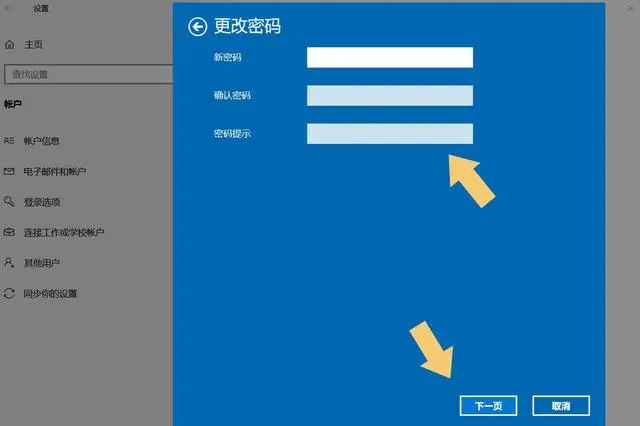 6、点击下一步后,界面会再次跳转,我们输入两遍新的密码,根据使用习惯设置提示问题,然后点击下一步。如下图: