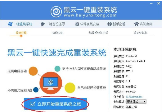 1、首先我们在电脑上下载安装黑云一键装机并打开,点击立即开始重装系统之旅。