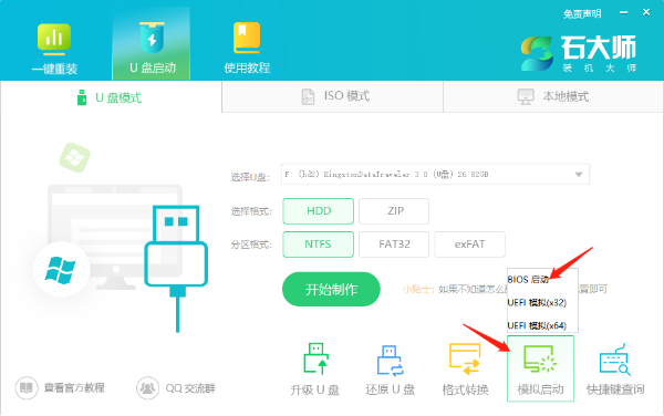 5、制作成功后,还需要点击软件右下角的模拟启动,用以测试U盘启动盘是否制作成功。