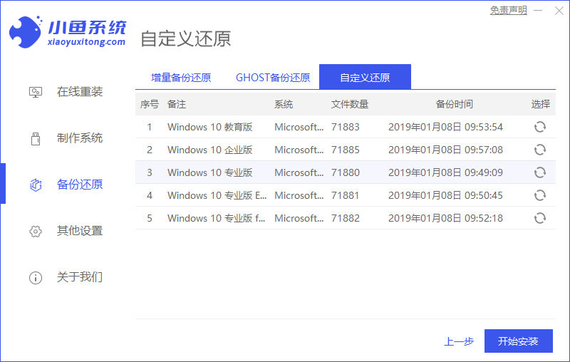 1、打开小鱼软件点击备份还原,再点击自定义还原选项卡,选择备份还原的资料,点击下一步。