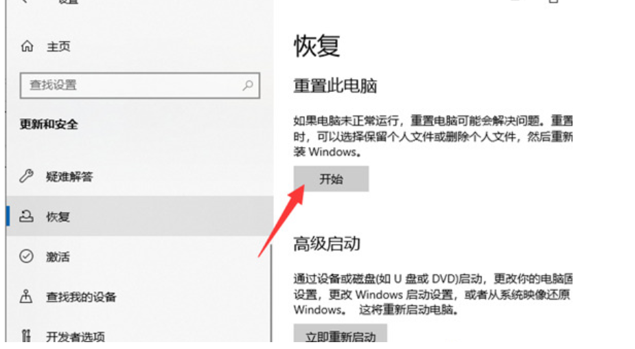 3、然后选择左侧的恢复,再选择右侧的开始按键重置电脑。