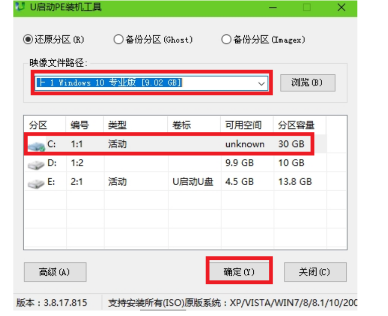 2、接着在工具中找到win10pe系统iso镜像文件,在分区列表中选择C盘作为系统盘,点击“确定”。