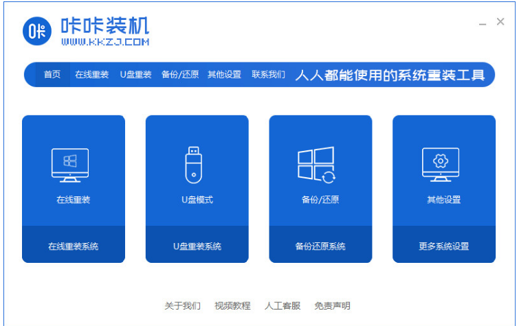 1.首先我们打开【咔咔装机】重装工具,在首页当中点击在线安装功能。