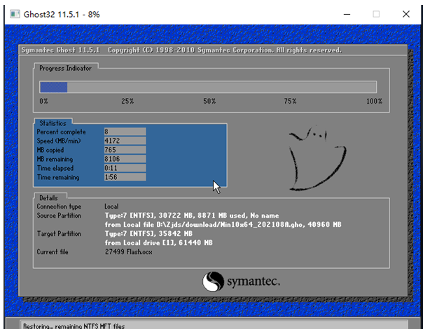 6、重启系统后,系统会默认进入PE环境,进入后,系统将会自动进行备份还原,等待完成。