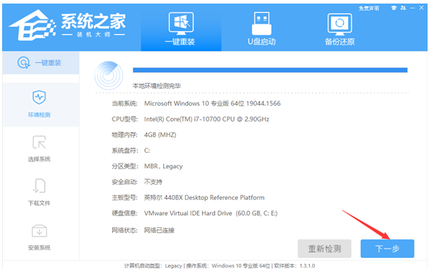 2、进入工具后,工具会自动检测当前电脑系统的相关信息,点击下一步。