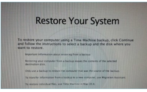 3、如果选择“Restore From Time Machine Backup”会出现如下界面,可以选择你以前备份到Time Machine 的映像文档恢复电脑,然后点击“continue”继续下一步的操作。