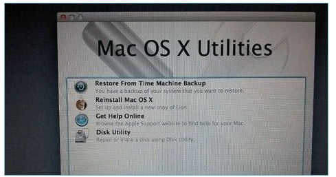 2、直到进入如下图界面,提供了4个选项选择:Restore From Time Machine Backup 用备份恢复电脑;Reinstall Mac OS X重新安装 Mac OS X;Get Help Online 线上取得安装的帮助;Disk Utility 管理硬盘时候用到,其中包括:磁盘的分区,磁盘的格式化等。
