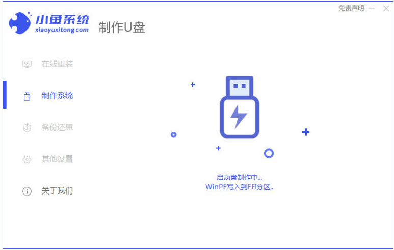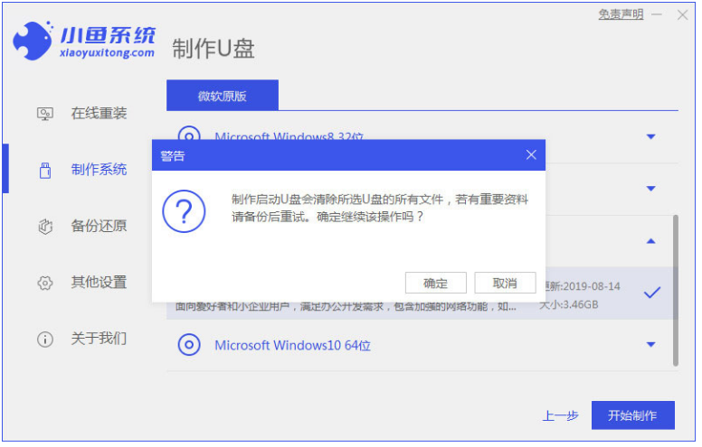 1、小鱼:http://www.xiaoyuxitong.com/下载安装小鱼装机工具软件,将u盘插入电脑点击u盘重装系统,选择好自己的u盘设备,点击开始制作。