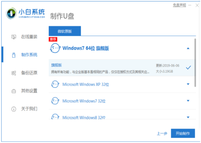 1、插入U盘到电脑接口上,打开小白一键重装系统软件,退出杀毒软件,选择制作系统中的U盘选项,选择U盘,点击开始制作。