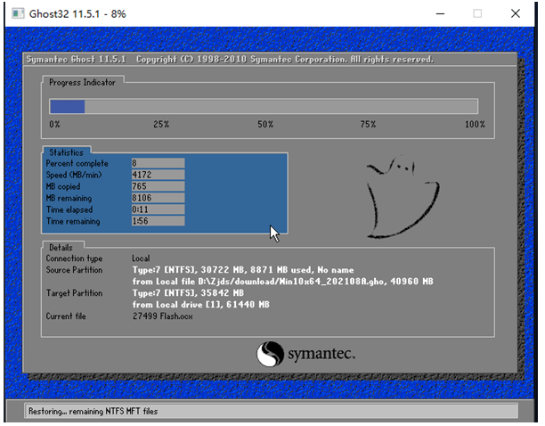 6、重启系统后,系统会默认进入PE环境,进入后,系统将会自动进行备份还原,等待完成。