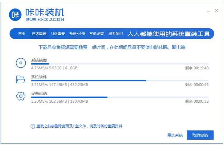 1.首先咔咔:http://www.kkzj.com/我们打开【咔咔装机】重装工具,在首页当中点击在线安装功能。
