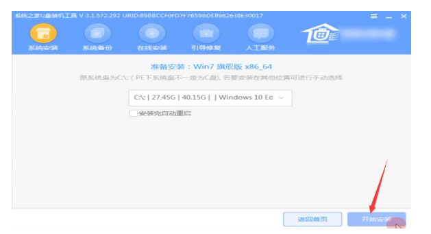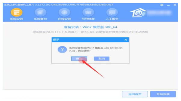 4.进入系统后,系统之家U盘软件会自动搜索系统镜像,找到镜像后,点击安装,准备安装界面中无需更改,点击开始安装。