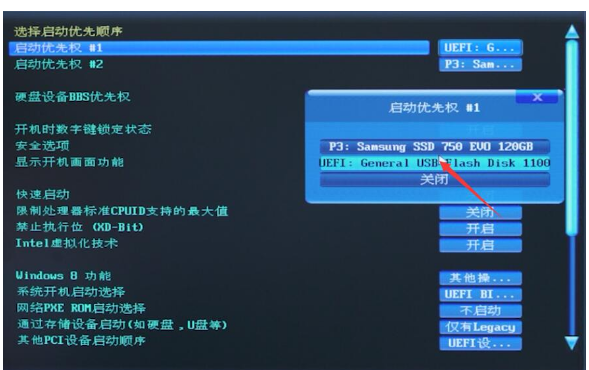 2.按下bios启动快捷键,进入bios界面,选择启动优先权 #1选项,回车选择带USB字样的选项,按F10保存重启电脑。