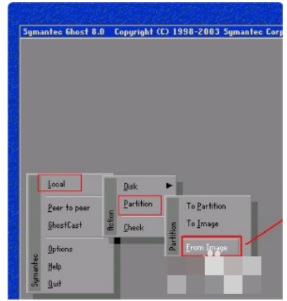 步骤四:在出现的灰色GHOST界面中以方向键控制,顺序是Local—>Partition—>From Image。