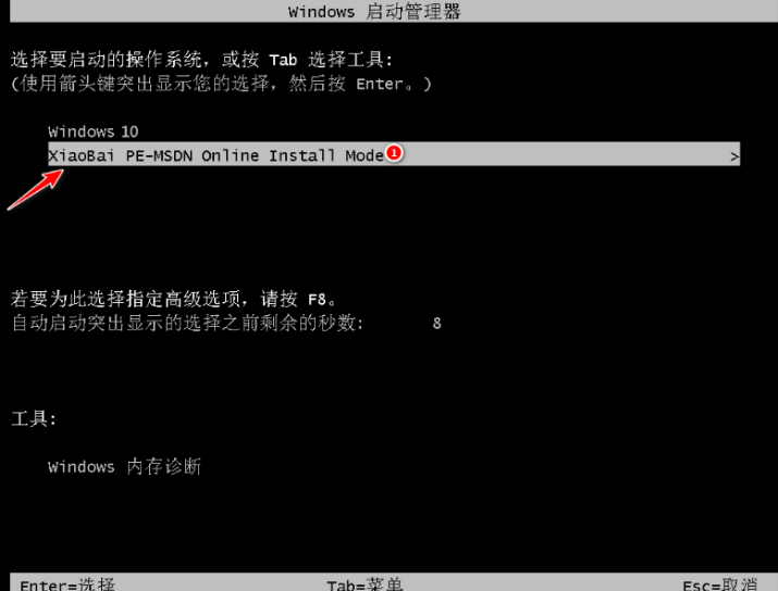 3、电脑重启后进入了开机选项界面,选择第二项xiaobai-pe系统进入。