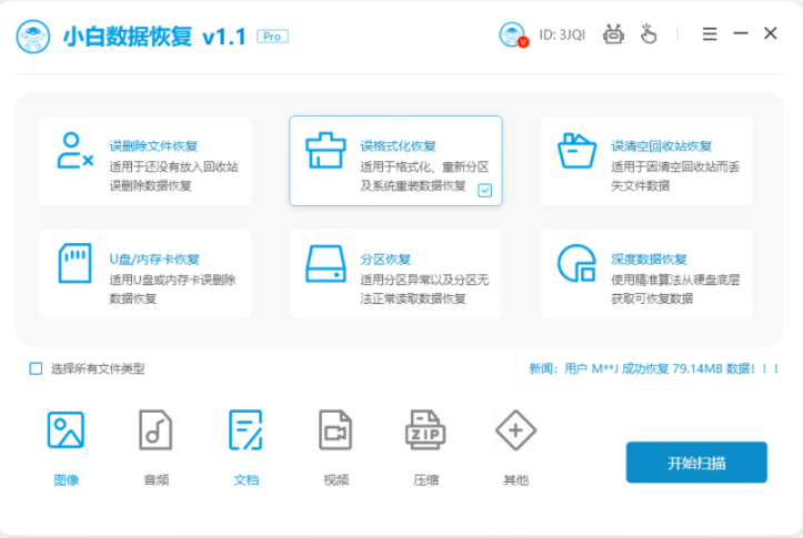 2、打开小白数据恢复工具后,在功能栏选择我们需要恢复的文件类型,点击开始扫描。