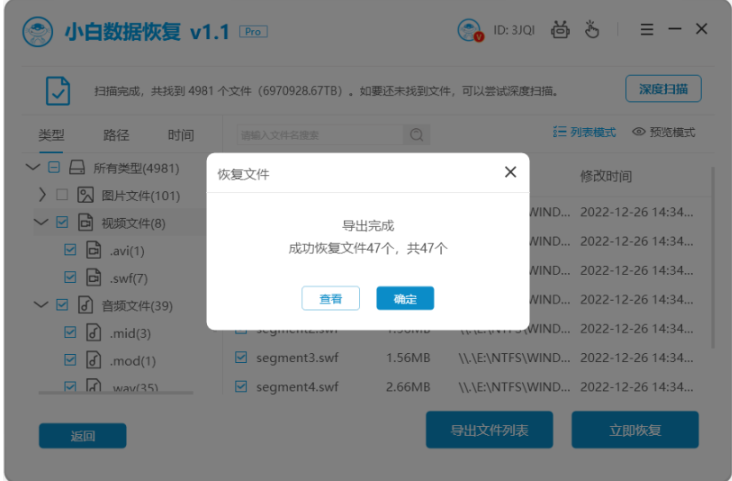 5、期间需要我们设置需要保存的文件的位置,等待全部文件恢复完毕,点击确定,去到文件存储位置即可开始查看。