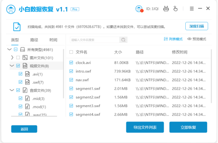 4、耐心等待数据扫描完成后,选择我们需要恢复的文件类型,点击立即恢复,耐心等待软件对这些数据进行恢复。