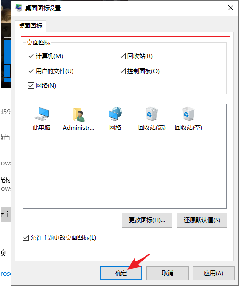 4.勾选桌面图标中的全部选项,然后点击 “确定”即可。
