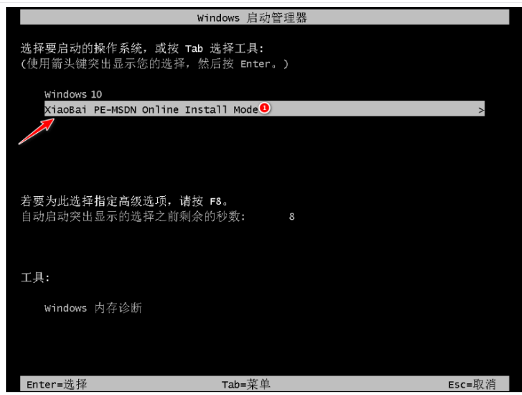 3、电脑重启后进入了开机选项界面,选择第二项xiaobai-pe系统进入。