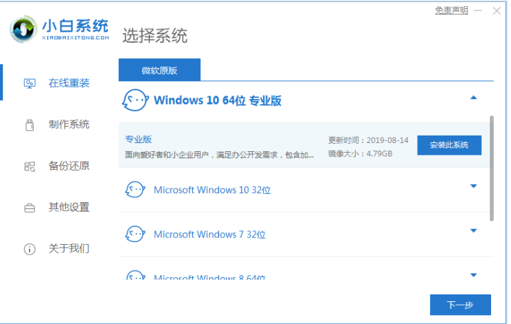 1、下载小白一键重装系统工具打开,选择win10系统点击安装。