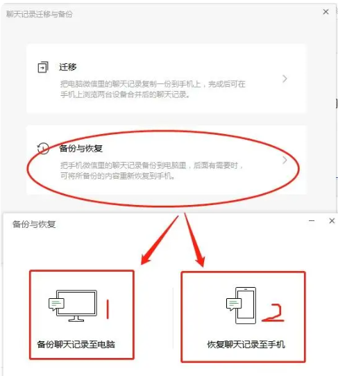 2、点击“备份与恢复”选项,接着选择恢复聊天记录的方式:恢复聊天记录至手机即可。