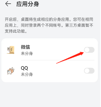 4、点击微信右边的滑块开关,稍等几秒创建应用分身。
