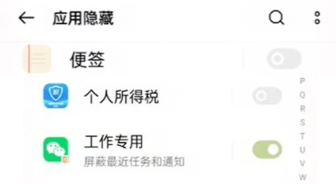7、需要输入我们的隐私密码,这边一定要自己设置一个,这里边有很多的应用都可以隐藏起来的,比如说我现在想把微信工作专用给他隐藏起来,就需要把后面打上对勾,这样的话,就隐藏起来了。
